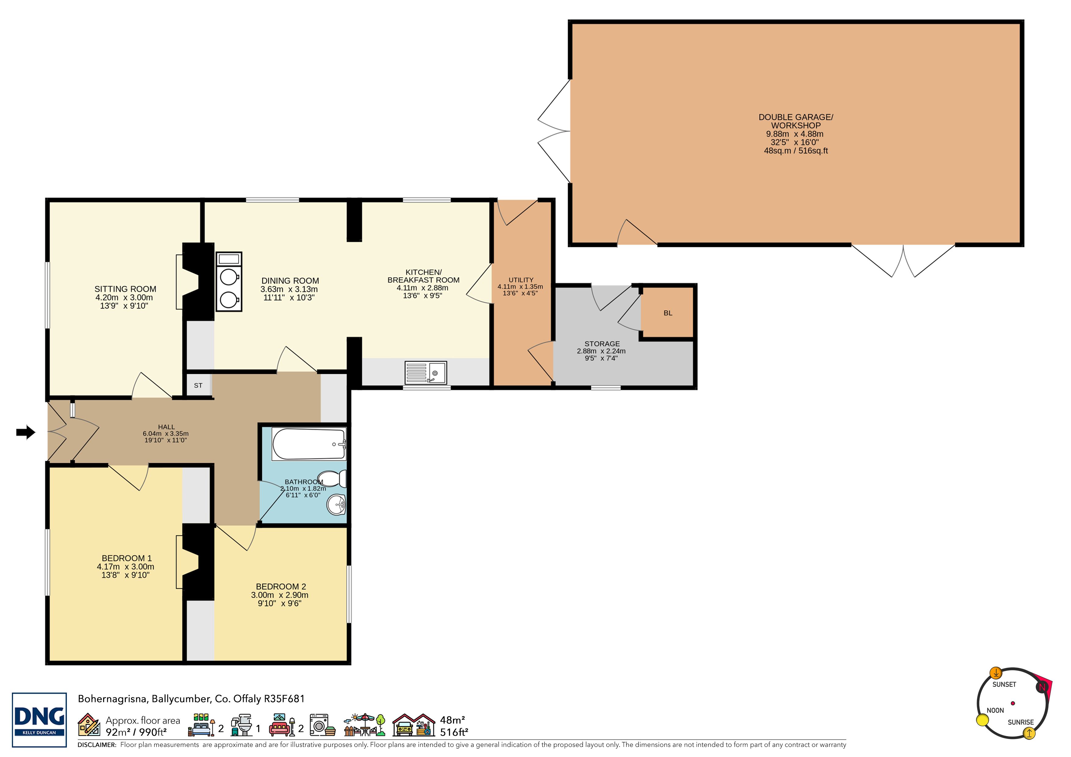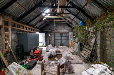 The accommodation comprises an Entrance Hallway, Sitting Room, Living Room, Kitchen/Dining, Bathroom & Two Bedrooms. Additionally, a large detached garage at the rear of the property provides versatile storage or workshop space.