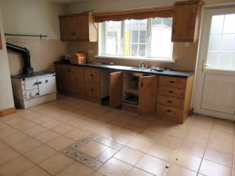 Fitted kitchen, solid fuel Stanley stove, hotpress, tiled floor, sink, radiator, rear door