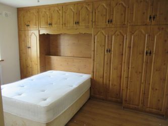 Large bedroom with fitted wardrobes and over bed units. Laminate flooring, radiator